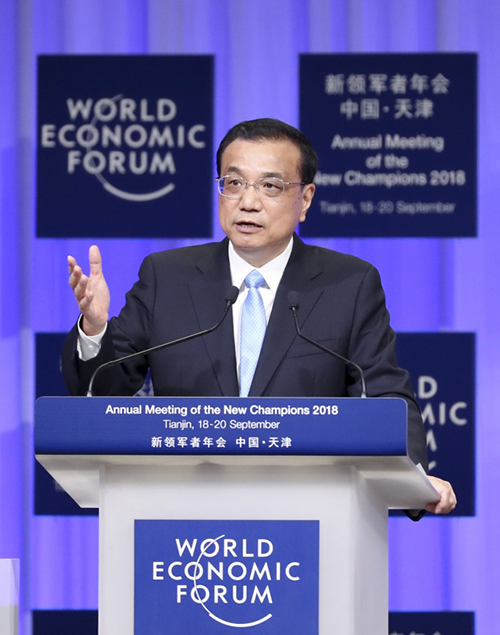 9月19日,國(guó)務(wù)院總理李克強(qiáng)在天津梅江會(huì)展中心出席2018年夏季達(dá)沃斯論壇開幕式并發(fā)表特別致辭。新華社記者 丁海濤 攝