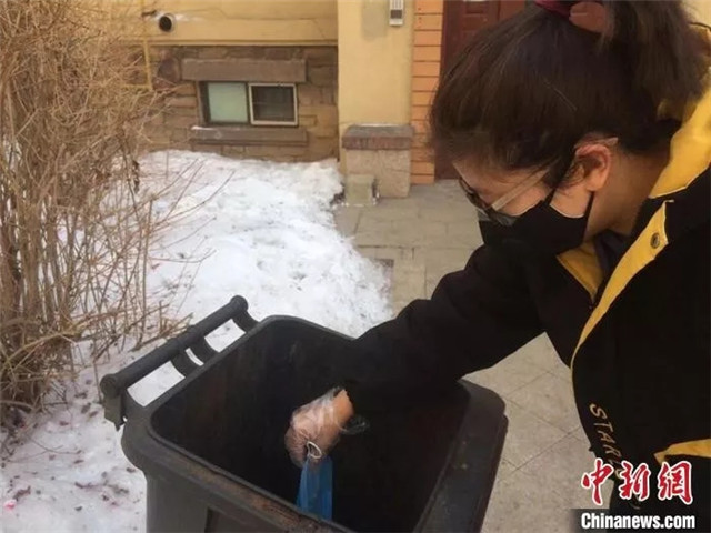 在小區(qū)的垃圾桶里翻找舊口罩