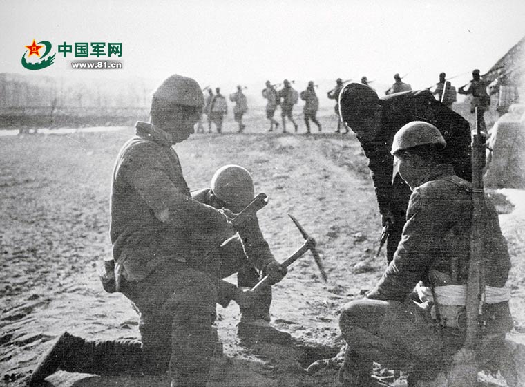 晉察冀邊區(qū)民兵在敵人將要經(jīng)過(guò)的河灘上埋地雷。