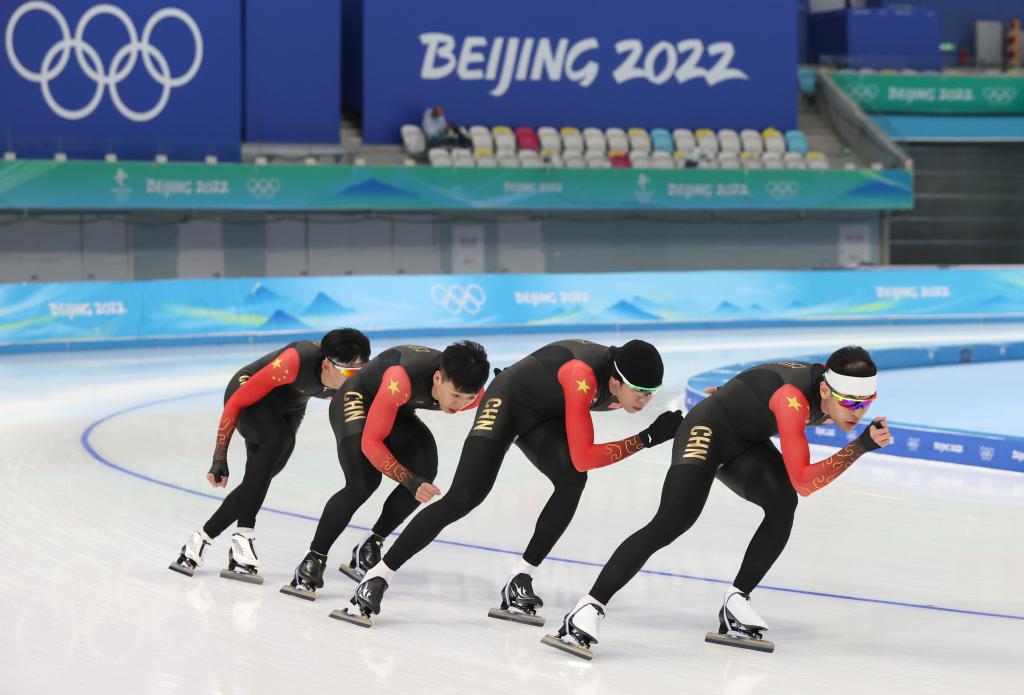 1月29日,中國速度滑冰隊隊員寧忠?guī)r、廉子文、徐富、王浩田(從右向左)在國家速滑館“冰絲帶”訓(xùn)練。新華社記者 丁旭 攝