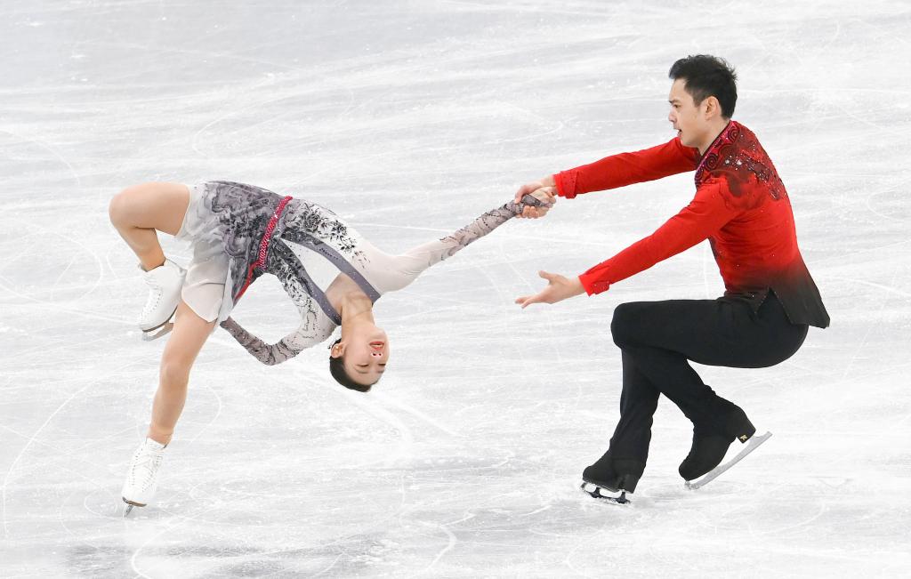 2月7日,中國選手彭程(左)、金楊在北京2022年冬奧會花樣滑冰團體賽雙人滑自由滑比賽中。新華社記者劉瀟攝