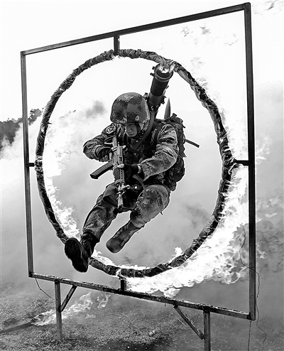 面對熊熊燃燒的火障,一名戰(zhàn)士敢于挑戰(zhàn)內心的恐懼,毫不猶豫地邁開步伐,奮力一跳,順利穿越火障,動作干凈又利索。