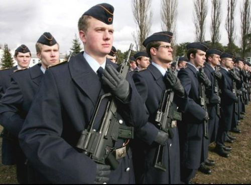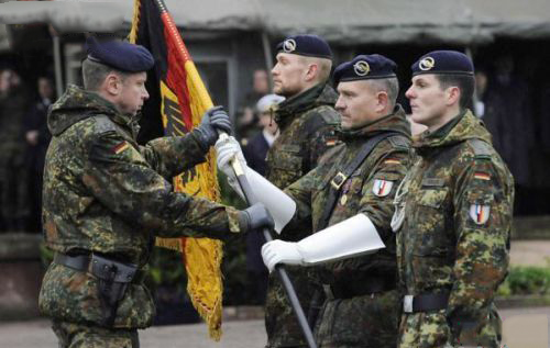 歐盟快速反應(yīng)部隊(duì)德法旅德軍軍人(注意肩章上表示步兵的綠色兵種線)在授旗儀式上,他們身穿德軍Parka風(fēng)衣,也是一種作戰(zhàn)服大衣,但是造型上已經(jīng)無(wú)法與常禮服大衣相比拼——當(dāng)然即使是大肚子,只要?dú)赓|(zhì)到位,衣服上配飾到位,身材其實(shí)不是很重要。