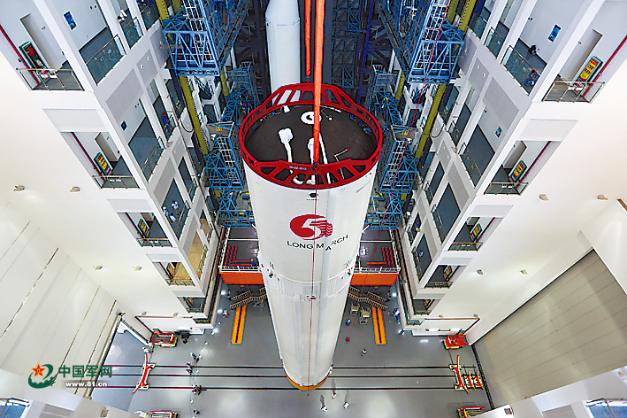 長征五號遙三運載火箭在廠房吊裝。屠海超攝
