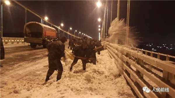 1月25日,江蘇地區(qū)連降暴雪,南京市區(qū)內(nèi)各路段積雪嚴(yán)重,市區(qū)主要路段交通癱瘓、中小學(xué)停課,居民生活受到極大影響。災(zāi)情就是命令,合成某旅出動(dòng)800余名官兵,連夜趕赴南京長江四橋進(jìn)行除冰掃雪,確保路面通暢,恢復(fù)人民出行秩序。(劉德、周志鵬攝)