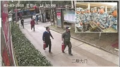 小區(qū)監(jiān)控視頻記錄下了李道洲(右二藍(lán)衣男子)奔向火場的最后畫面。 右上圖為李道洲(右二)在工作中講授裝備管理使用知識(shí)。