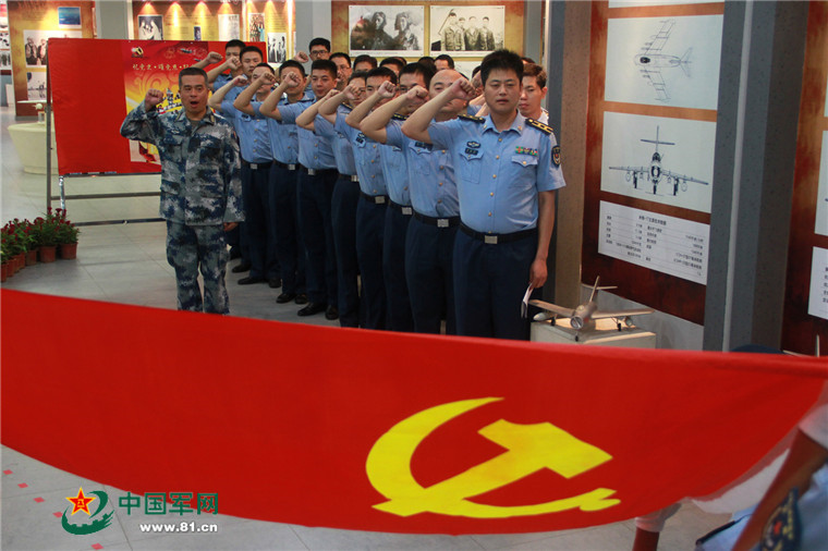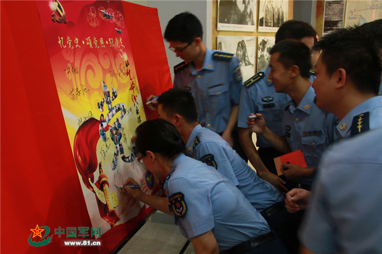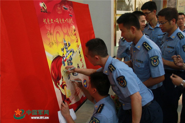 南部戰(zhàn)區(qū)空軍航空兵某師政治部全體官兵齊聚師史館“3:0”戰(zhàn)斗紀(jì)念畫像前,唱響《國(guó)際歌》,主任尹翔帶領(lǐng)黨員面對(duì)黨旗重溫入黨誓詞,官兵代表訴說感言,全體黨員在自己頭像拼寫成的“黨”字宣傳畫上鄭重簽字,對(duì)黨作出自己的莊嚴(yán)承諾。