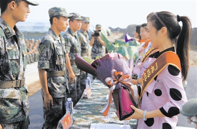 “兵媽媽”“好軍嫂”接過官兵獻(xiàn)上的鮮花。 孫嘉陽 攝