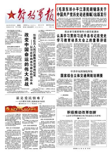 新華社北京2月24日電 中共中央黨史和文獻研究院編輯的《毛澤東鄧小平江澤民胡錦濤關于中國共產黨歷史論述摘編》一書,近日由中央文獻出版社出版,在全國發(fā)行。