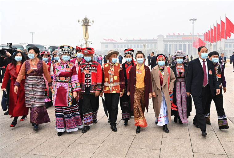 ↑2021年3月5日,十三屆全國(guó)人大四次會(huì)議在北京開(kāi)幕,全國(guó)人大代表走向會(huì)場(chǎng)。在十三屆全國(guó)人大代表中,少數(shù)民族代表占代表總數(shù)的14%以上,全國(guó)55個(gè)少數(shù)民族都有本民族的代表。
