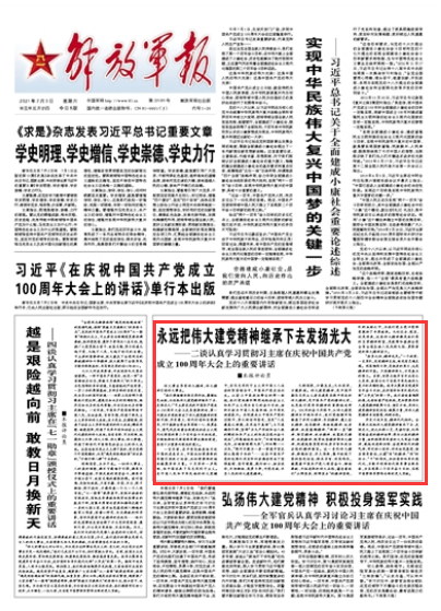 “我們要繼續(xù)弘揚光榮傳統(tǒng)、賡續(xù)紅色血脈,永遠把偉大建黨精神繼承下去、發(fā)揚光大!”習主席在慶祝中國共產(chǎn)黨成立100周年大會上發(fā)表重要講話,第一次提出并深刻闡述了偉大建黨精神的深刻內(nèi)涵、歷史意義、時代價值和實踐要求,對于激勵全黨全軍團結一心、英勇奮斗,意氣風發(fā)向著全面建成社會主義現(xiàn)代化強國的第二個百年奮斗目標邁進,不斷把新時代強國強軍事業(yè)推向前進,具有十分重要而深遠的意義。