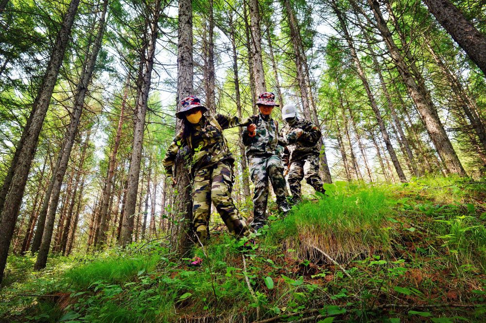 ↑工作人員行走在塞罕壩機(jī)械林場(2017年7月14日攝)。