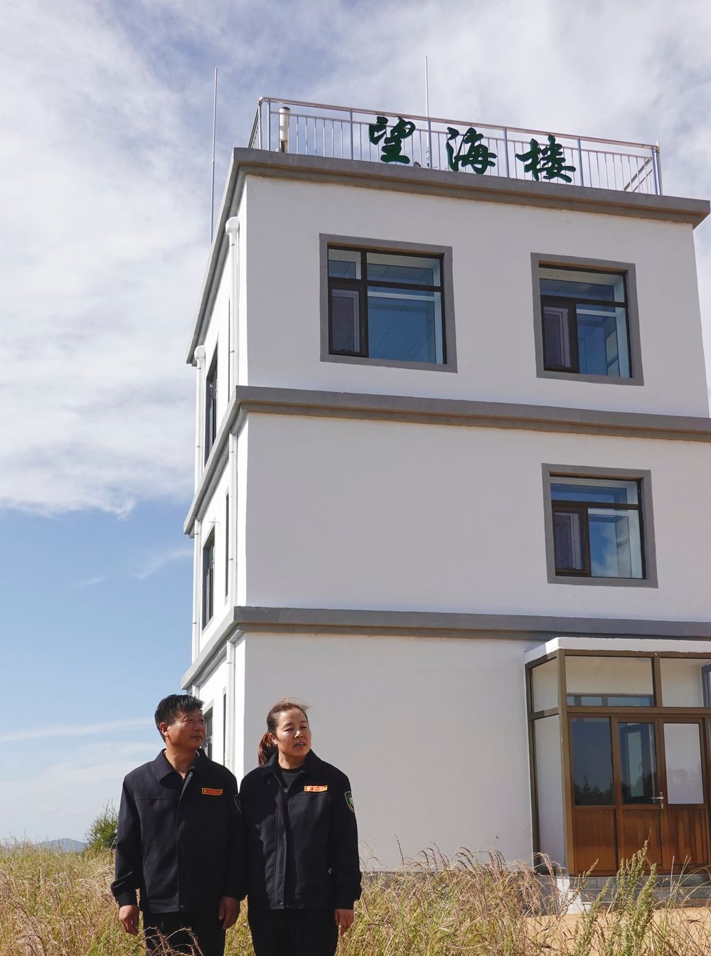 ↑護(hù)林員劉軍(左)、王娟在塞罕壩機(jī)械林場望海樓前(2021年8月23日攝)。在13年的堅守中,劉軍、王娟夫婦用常人難以想象的辛勤付出守護(hù)林場安全。