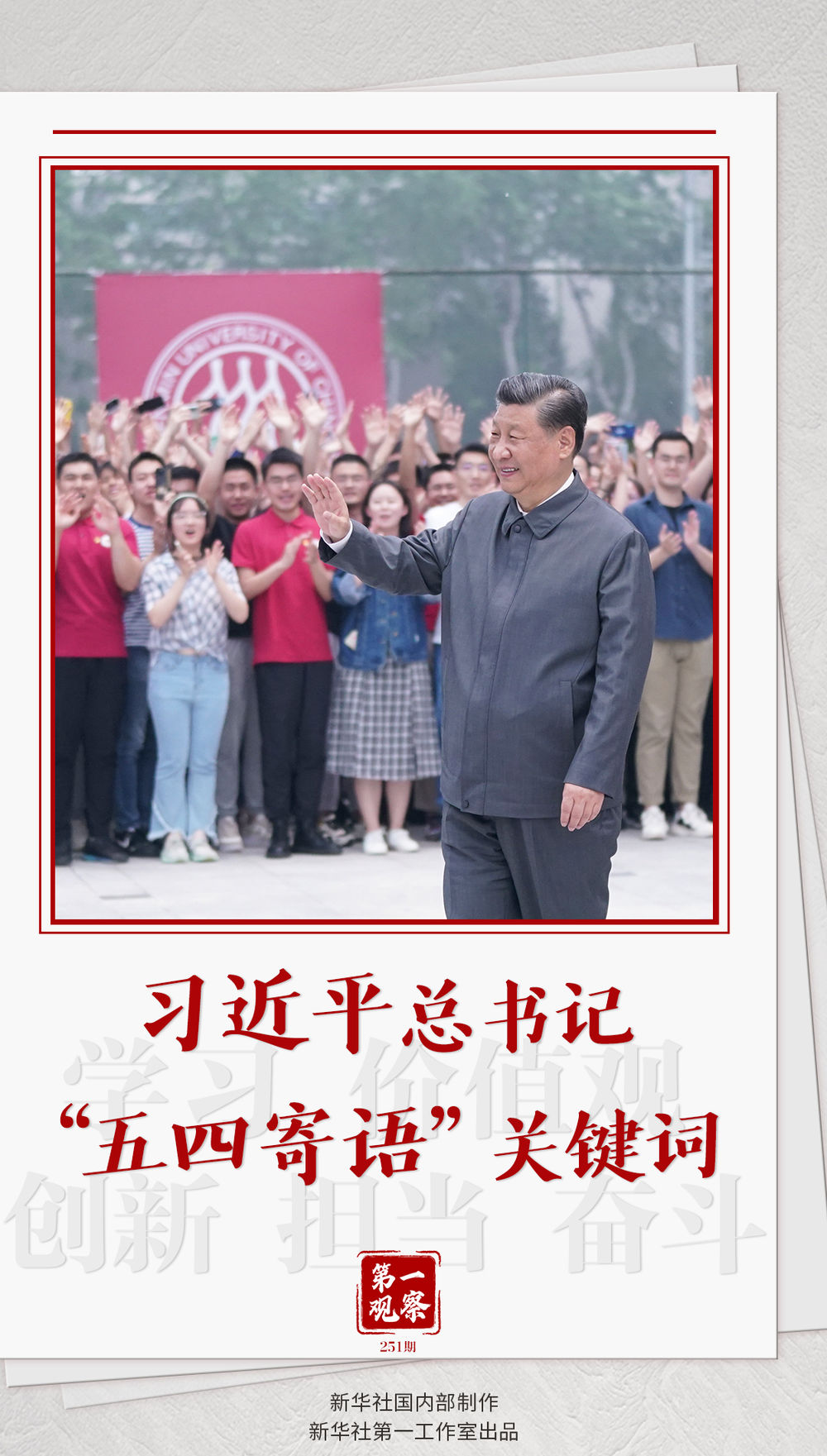 “五四運動以來的100年,是中國青年一代又一代接續(xù)奮斗、凱歌前行的100年,是中國青年用青春之我創(chuàng)造青春之中國、青春之民族的100年?!?/p>