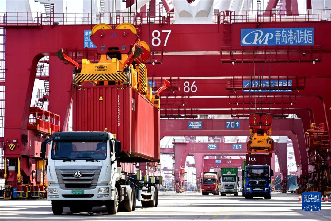 繁忙的山東港口青島港前灣港區(qū),集裝箱貨輪在裝卸集裝箱(6月15日攝,無人機照片)。青島海關(guān)數(shù)據(jù)顯示,今年1月至5月,青島直達(dá)金磚國家的航線共完成箱量83萬標(biāo)箱,同比增長12%,其中出口量增長26.1%。新華社記者 李紫恒 攝