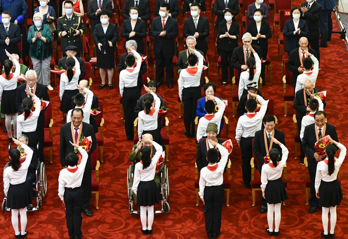 2021年6月29日,慶祝中國共產(chǎn)黨成立100周年“七一勛章”頒授儀式在北京人民大會(huì)堂金色大廳隆重舉行。這是少先隊(duì)員向勛章獲得者獻(xiàn)花,敬禮致意。新華社記者 高潔 攝