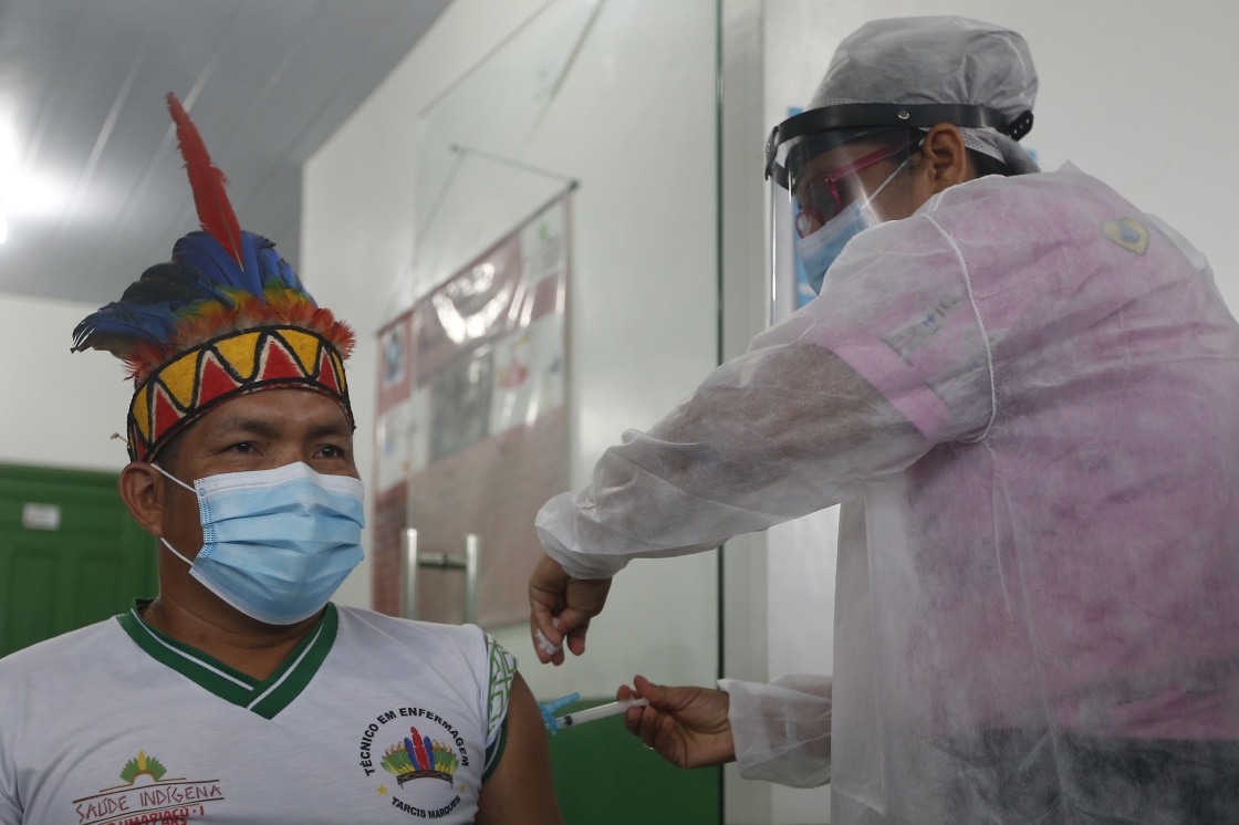 2021年1月19日,醫(yī)護(hù)人員在巴西亞馬孫州塔巴廷加市為一名原住民接種中國(guó)新冠疫苗。新華社發(fā)(盧西奧·塔沃拉攝)