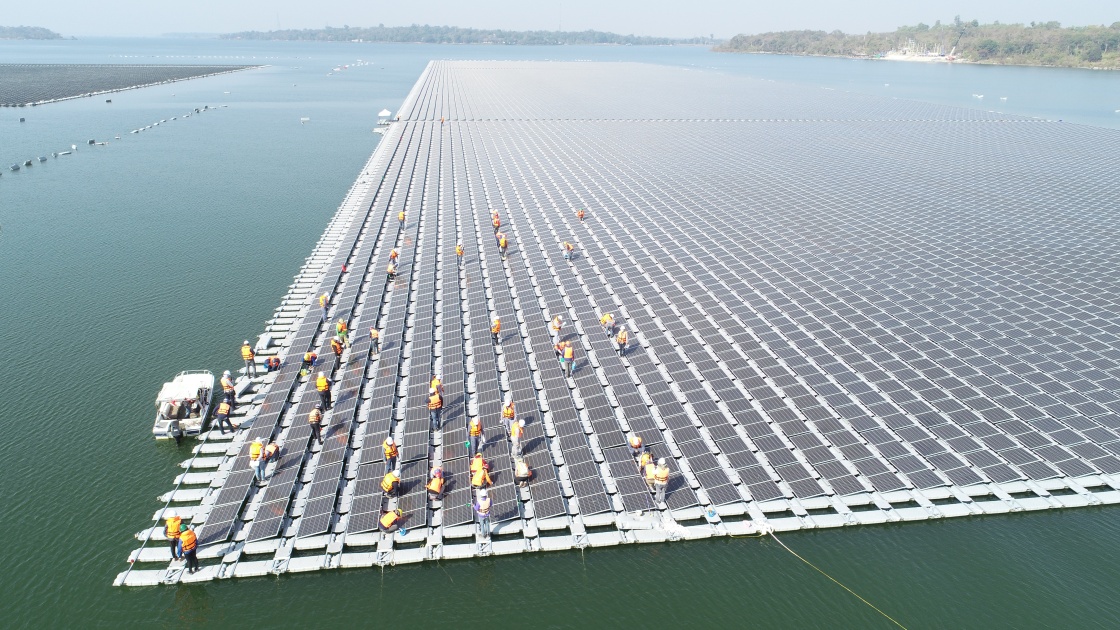 2021年1月23日,施工人員檢查中泰兩國(guó)聯(lián)合承建的泰國(guó)烏汶府詩(shī)琳通大壩綜合浮體光伏項(xiàng)目的太陽(yáng)能板安裝情況。新華社發(fā)(泰國(guó)國(guó)家電力局項(xiàng)目組供圖)