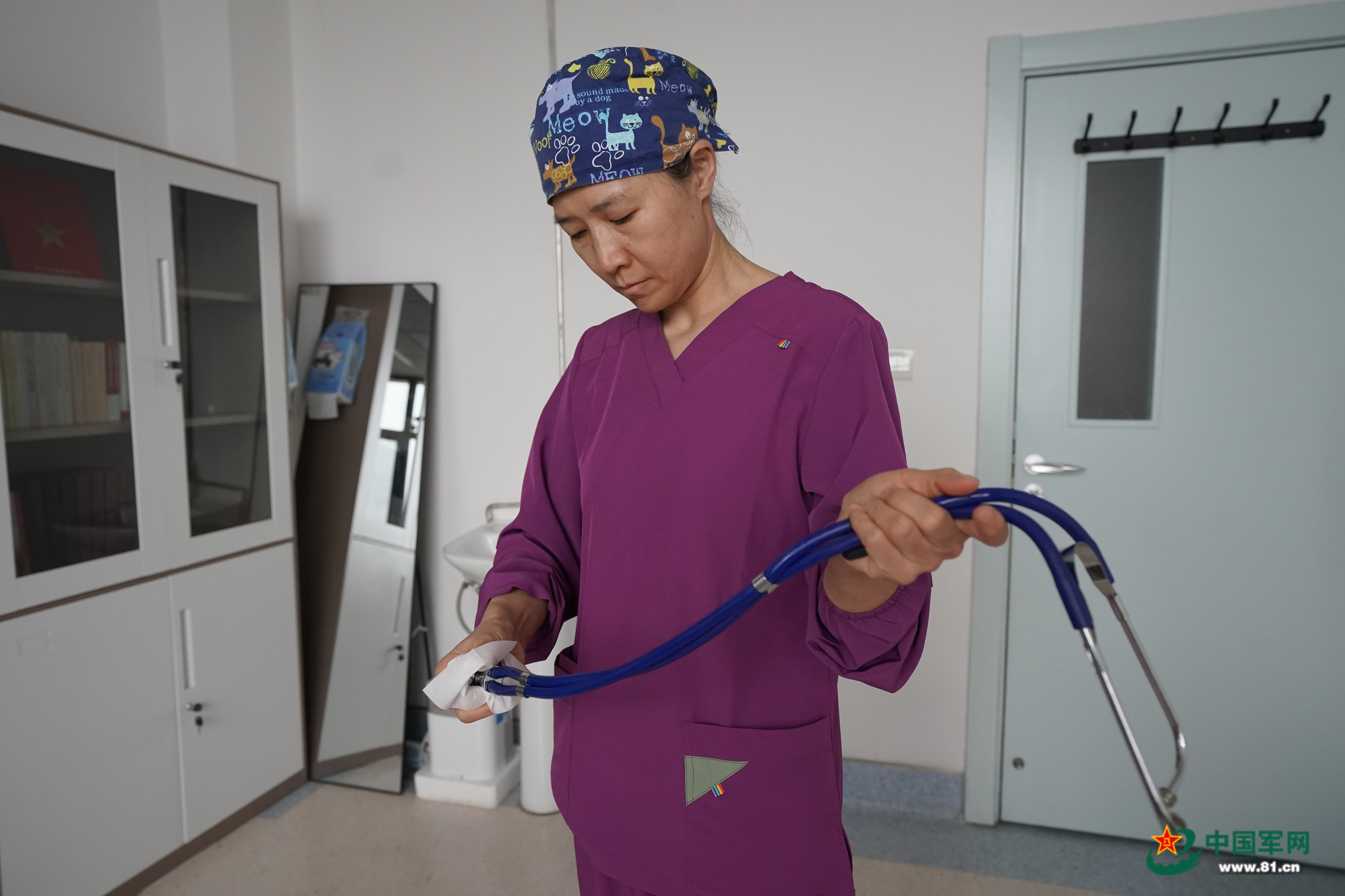 張瑛對聽診器進(jìn)行酒精消毒。中國軍網(wǎng)記者 林詩清 攝