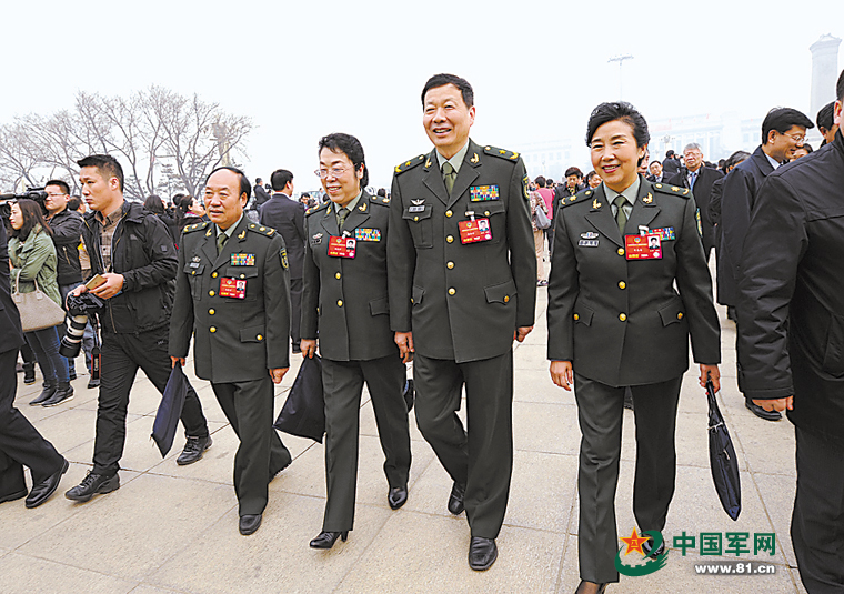 3月3日下午,出席全國(guó)政協(xié)十二屆四次會(huì)議的軍隊(duì)政協(xié)委員(從左至右)高春芳、侯艷寧、浦金輝、牛忠英走向會(huì)場(chǎng)。本報(bào)記者 穆瑞林?jǐn)z