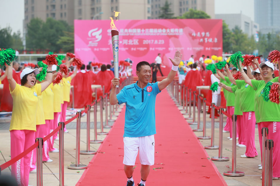 8月23日上午,第十三屆全運會火炬?zhèn)鬟f儀式第十四站在天津市河北區(qū)進行。