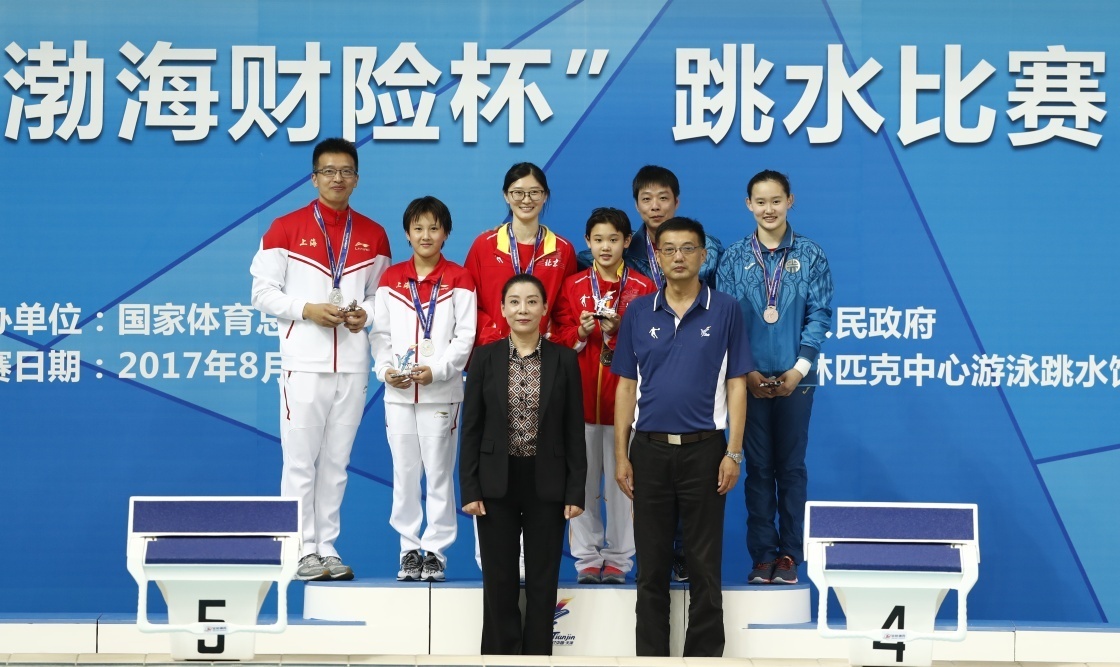 8月25日,冠軍北京選手張家齊(上右三)與教練(上左三)、亞軍上海選手掌敏潔(上左二)與教練(上左一)、季軍四川選手任茜(上右一)與教練(上右二)與頒獎嘉賓在頒獎儀式上合影。新華社記者 丁旭 攝