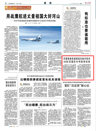 軍委裝備發(fā)展部首次集中發(fā)布4038項(xiàng)國(guó)防專利脫密信息