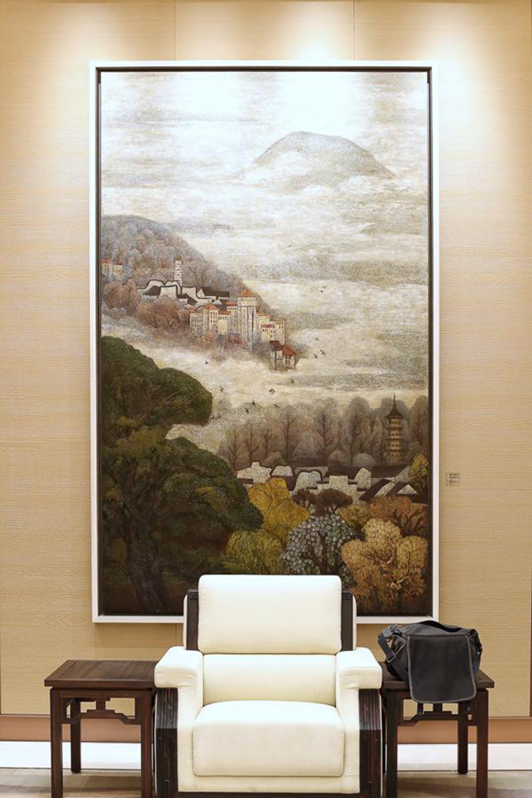 迎賓廳主背景,國畫《春風又綠江南岸》。由陳琪(中國美協(xié)理事、上海美協(xié)副主席)、江宏(中國美協(xié)會員、上海美協(xié)會員)、車鵬飛(中國美協(xié)會員、上海美協(xié)常務理事)、汪家芳(中國美協(xié)會員、上海美協(xié)常務理事)四位對江南生活、江南文化比較熟悉,畫功出眾的上海畫家創(chuàng)作完成。圖中為主創(chuàng)之一陳琪先生。中國畫《春風又綠江南岸》是目前全國最大的青綠山水作品。創(chuàng)作主題為飽含江南文化底蘊的江南春景。采用傳統(tǒng)平遠構圖,以大視野描繪出太湖、京杭大運河、錢塘江等水系相互交織的江南水鄉(xiāng),綠水青山、薄霧朝霞、桃紅柳綠、水榭亭廓、漁船釣叟,一派春意盎然之景象。
