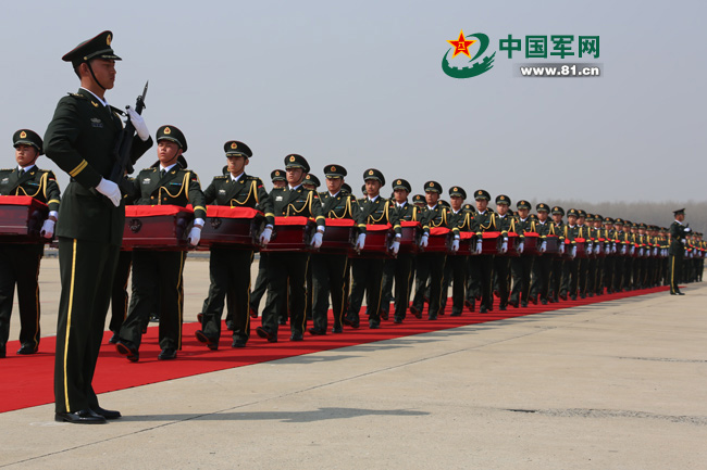 沈陽軍區(qū)某部禮兵將棺槨移至擺放區(qū)。