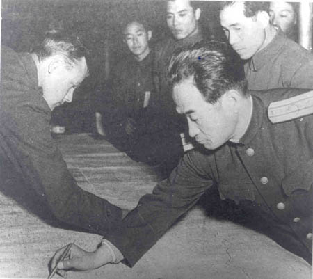 1951年11月27日,朝鮮停戰(zhàn)談判雙方代表在標(biāo)示“聯(lián)合國(guó)軍”和朝中軍隊(duì)軍事分界線的地圖上簽字,停戰(zhàn)談判雙方就第二項(xiàng)議程達(dá)成協(xié)議。
