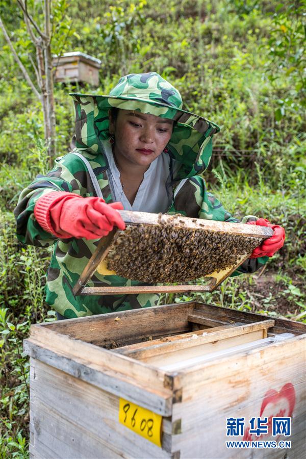 在云南省西盟縣勐梭鎮(zhèn)班母村中華蜂養(yǎng)殖基地,二妹在檢查蜂箱情況(6月16日攝)。 精準(zhǔn)扶貧的春風(fēng),吹到了西南邊疆。在云南省西盟縣的拉祜山寨,人們告別了吃不飽、穿不暖、沒(méi)有安全住房的日子。學(xué)習(xí)先進(jìn)技術(shù),改變精神面貌,發(fā)展養(yǎng)蜜蜂、種甘蔗等甜蜜產(chǎn)業(yè),拉祜人的日子越過(guò)越甜。 新華社記者 胡超 攝