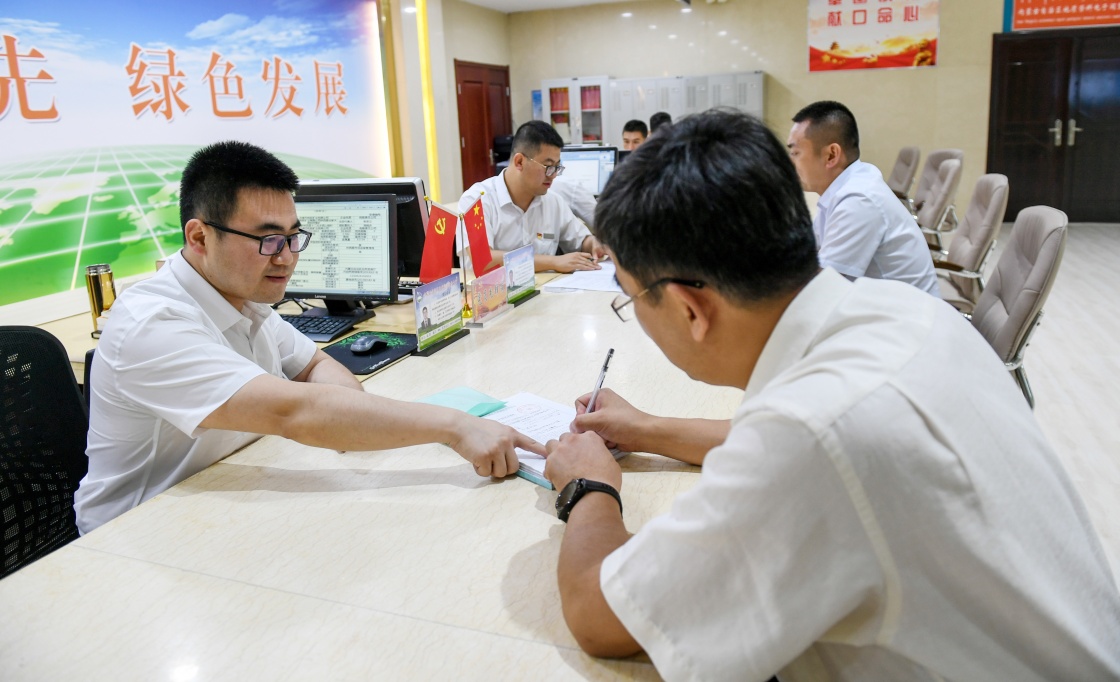 2019年7月16日,在內(nèi)蒙古自治區(qū)自然資源廳的自然資源政務(wù)大廳內(nèi),辦事員(左)為采礦企業(yè)辦理相關(guān)審批手續(xù)。新華社記者 彭源 攝