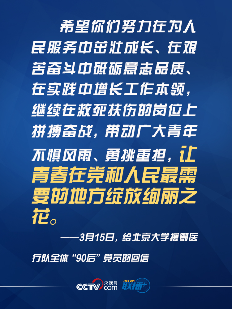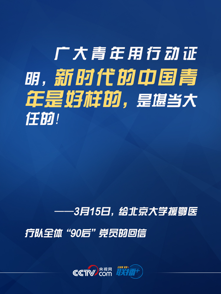 聯(lián)播+ “廣大青年用行動證明,新時代的中國青年是好樣的,是堪當大任的!”在3月15日給北京大學(xué)援鄂醫(yī)療隊全體“90后”黨員的回信中,習(xí)近平這樣點贊新時代中國青年。