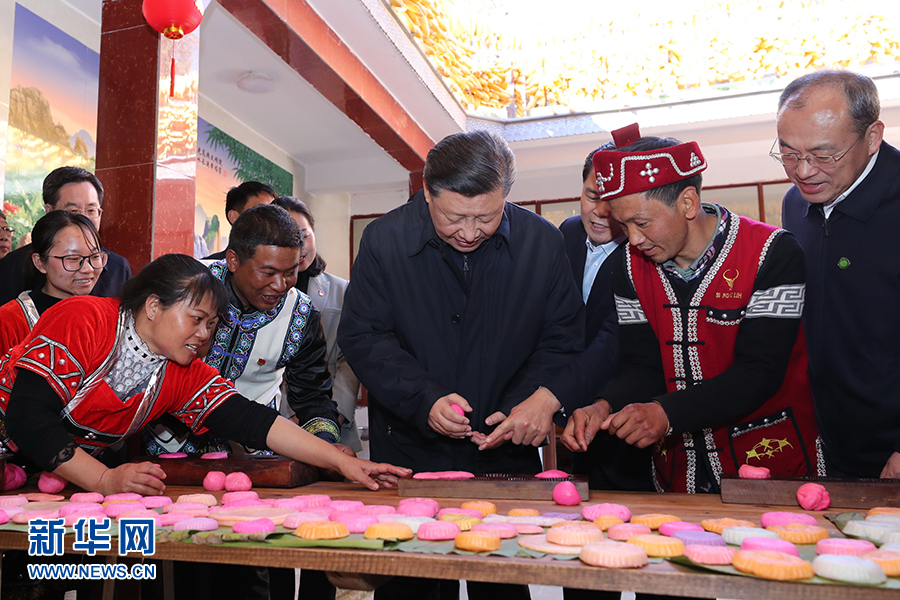 2020年1月19日下午,習(xí)近平在騰沖市清水鄉(xiāng)三家村中寨司莫拉佤族村,同村民李發(fā)順一家制作當(dāng)?shù)毓?jié)日傳統(tǒng)食品大米粑粑。 新華社記者 鞠鵬 攝