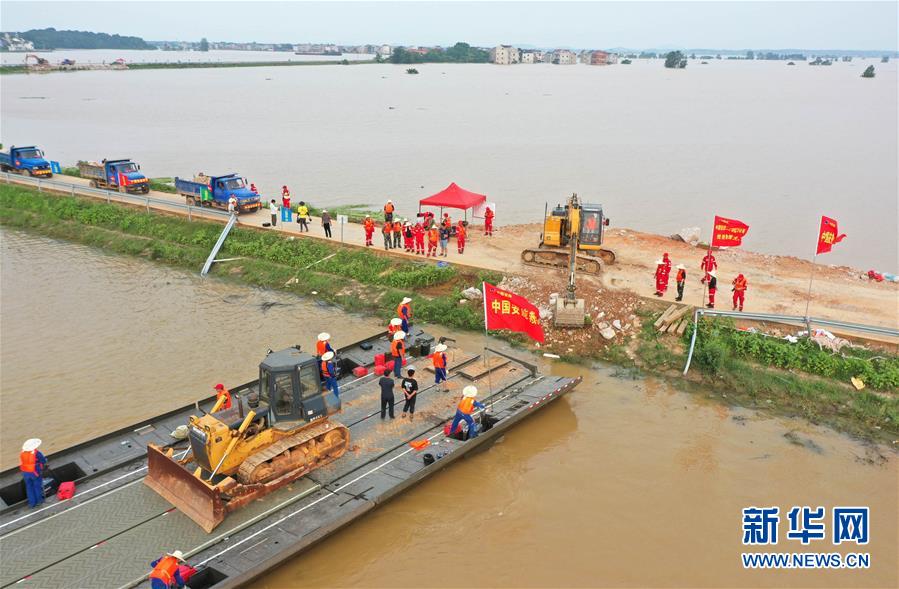江西鄱陽縣昌洲鄉(xiāng)中洲圩決口封堵中,中國安能建設(shè)集團(tuán)搶險(xiǎn)隊(duì)員利用動(dòng)力舟橋運(yùn)送搶險(xiǎn)裝備(2020年7月13日攝)。新華社發(fā)(中國安能建設(shè)集團(tuán) 供圖)