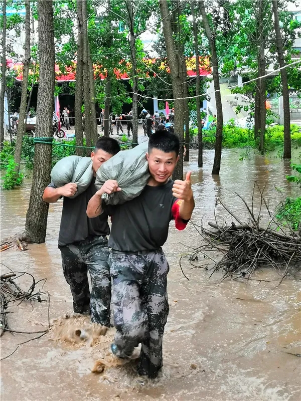 同“勁旅”救援官兵一道扛沙袋、筑堤壩