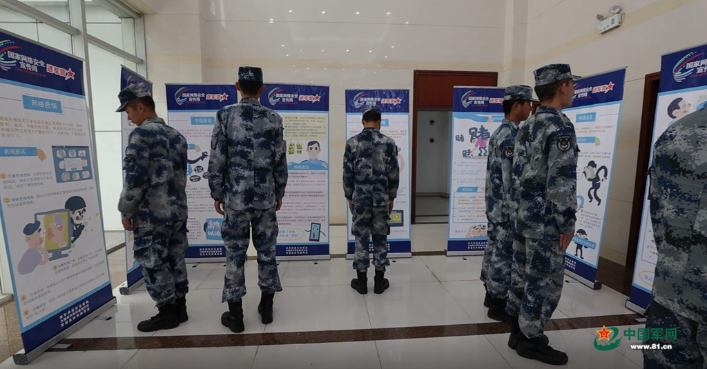 西部戰(zhàn)區(qū)空軍某運輸航空兵師組織的國家網(wǎng)絡安全宣傳周活動現(xiàn)場,官兵們在網(wǎng)絡安全宣傳知識展板前參觀學習。
