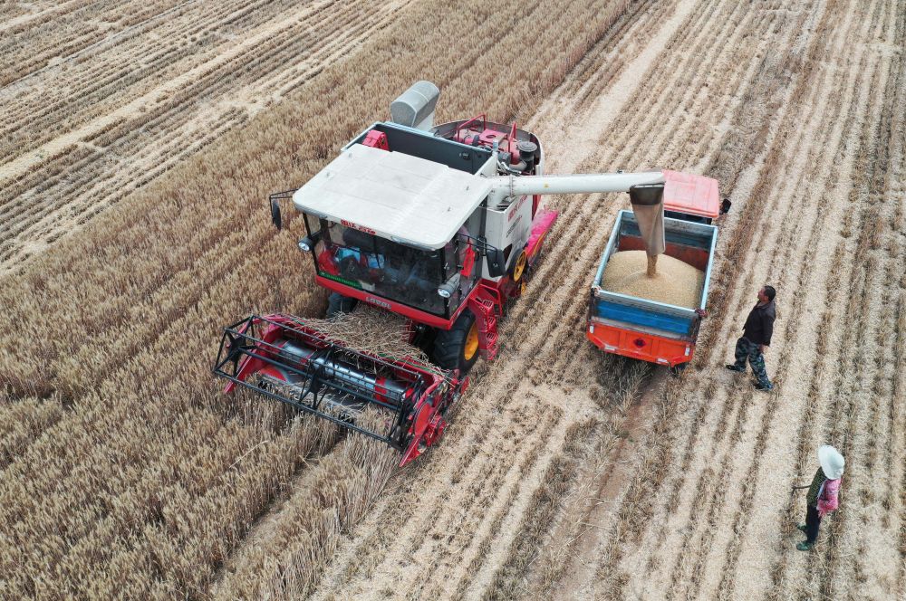 6月1日,收割機(jī)在山東省臨沂市郯城縣郯城街道三井村田間收割小麥(無人機(jī)照片)。新華社發(fā)(張春雷 攝)