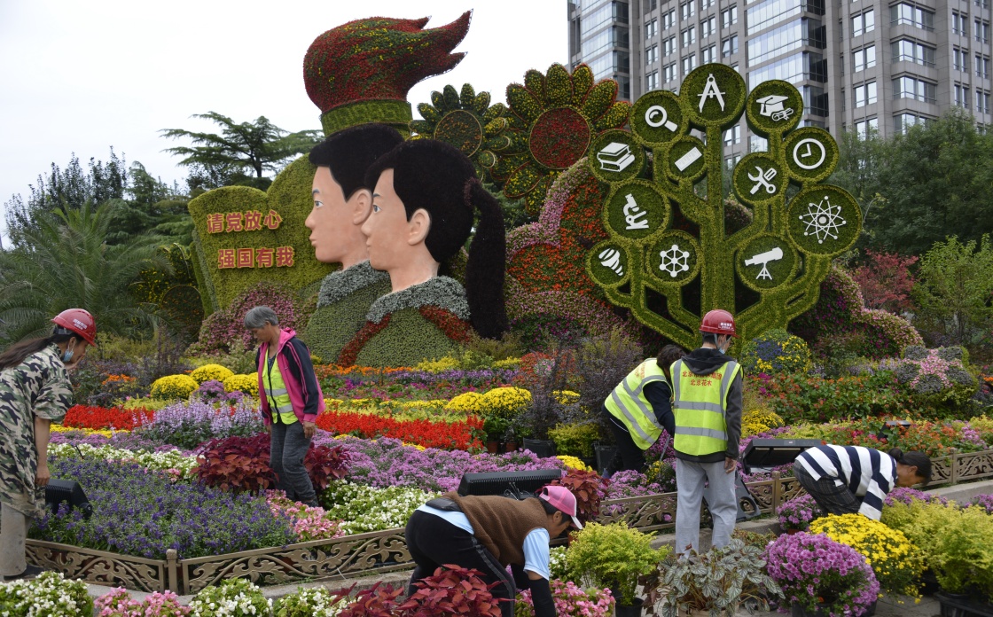 9月25日,園林工人對(duì)北京長(zhǎng)安街東單路口的主題花壇進(jìn)行最后修飾。