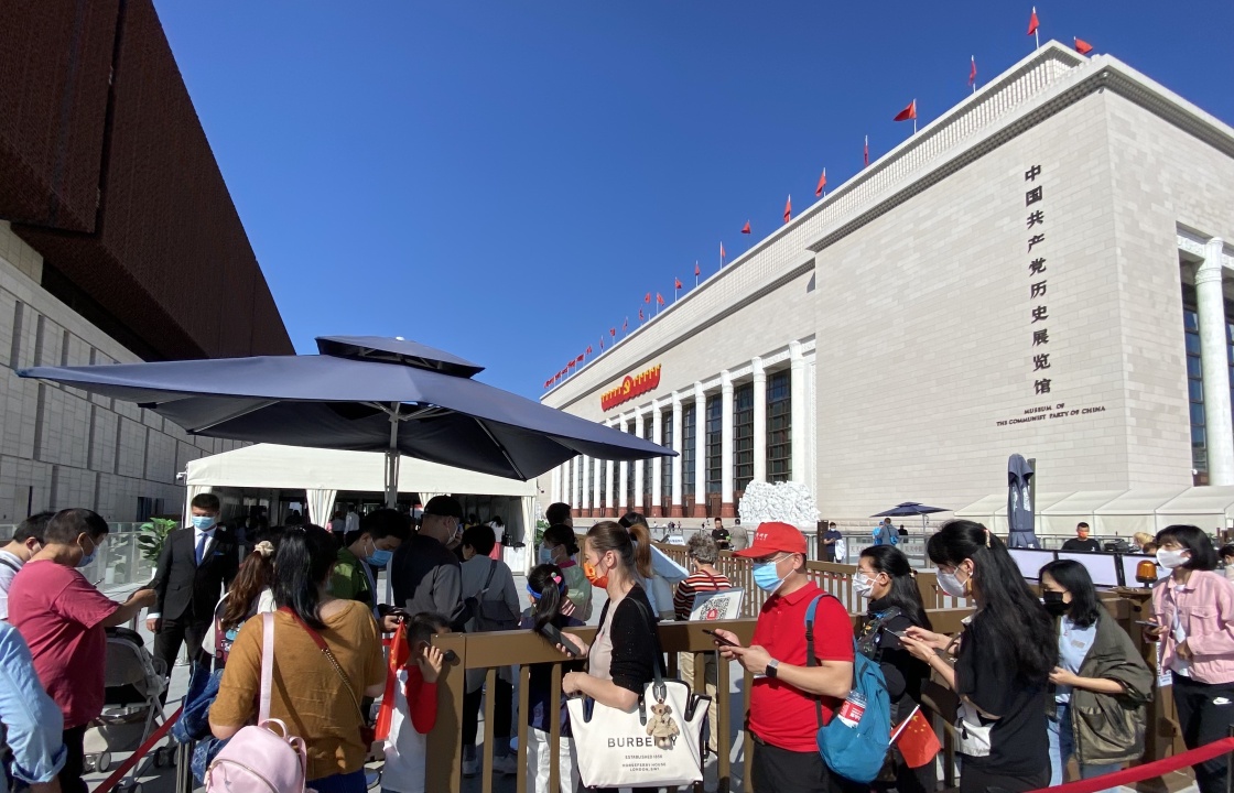 10月1日,人們在中國共產(chǎn)黨歷史展覽館入口處排隊入館。新華社記者 李賀 攝