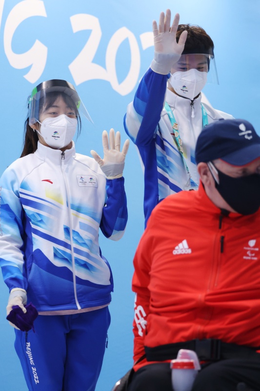 3月6日,志愿者在輪椅冰壺循環(huán)賽前向進場運動員揮手致意。
