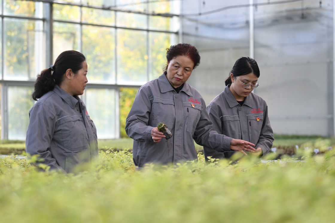 在青海省西寧市林業(yè)科學(xué)研究所的溫室內(nèi),張錦梅(中)與同事在查看種苗(9月14日攝)。新華社記者 張龍 攝