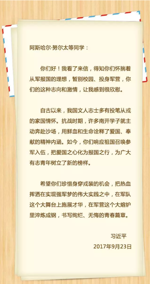 于是,今年應(yīng)征入伍的8名南開學子阿斯哈爾·努爾太、胡一帆、蔚晨陽、王晗、賈嵐珺、戴蕊、李業(yè)廣、董旭東把想寫給習主席的話記錄下來,寄給了習主席。不久后,他們分赴大江南北的火熱軍營。