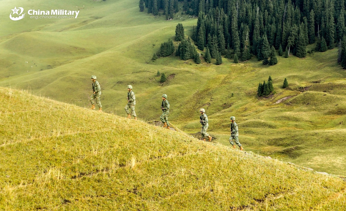 Soldiers assigned to a border defense company under the Chinese PLA Army walk along the mountain trail during a routine patrol mission in recent days. (eng.chinamil.com.cn/Photo by Zheng Yaqi)近日,陸軍某邊防連官兵執(zhí)行邊境巡邏任務(wù)。圖為官兵們?cè)谏介g巡邏。(英文中國(guó)軍網(wǎng)/鄭亞奇 攝)