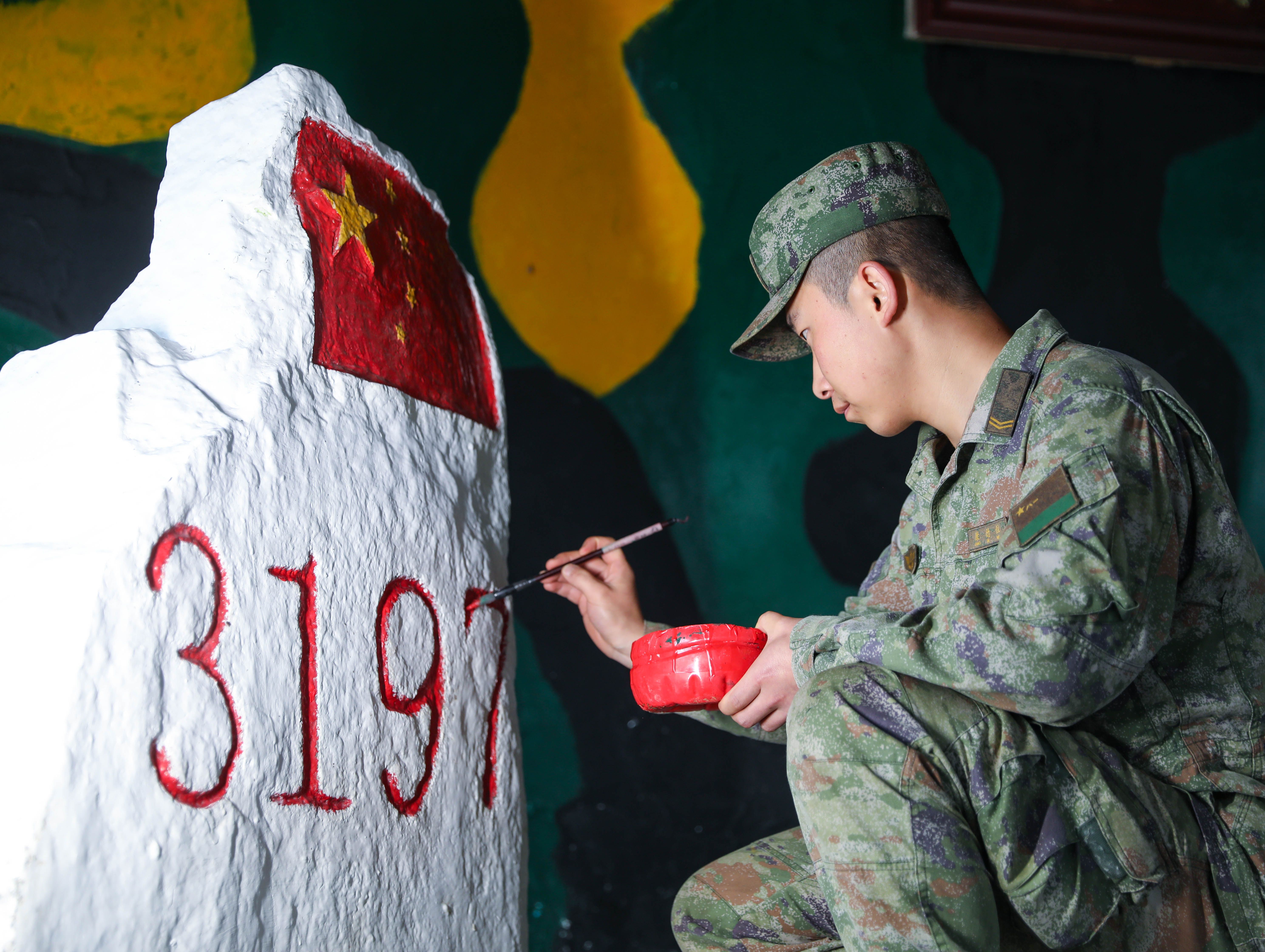在距離哨所下方100多個(gè)臺(tái)階旁的石坡上,一幅官兵手繪的國(guó)旗格外醒目,國(guó)旗下方“我在祖國(guó)邊陲,祖國(guó)在我心中”的字樣蒼勁有力,在夕陽(yáng)的映照下熠熠生輝,宛如戍邊官兵們一顆顆炙熱的愛(ài)國(guó)之心,閃耀著永不磨滅的光芒。