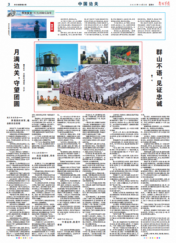 他知道,這個中秋,和過去的每個中秋一樣,連隊官兵守著邊,心里也裝著家。一家不圓萬家圓,守著邊,就是守著千萬個家的團圓。