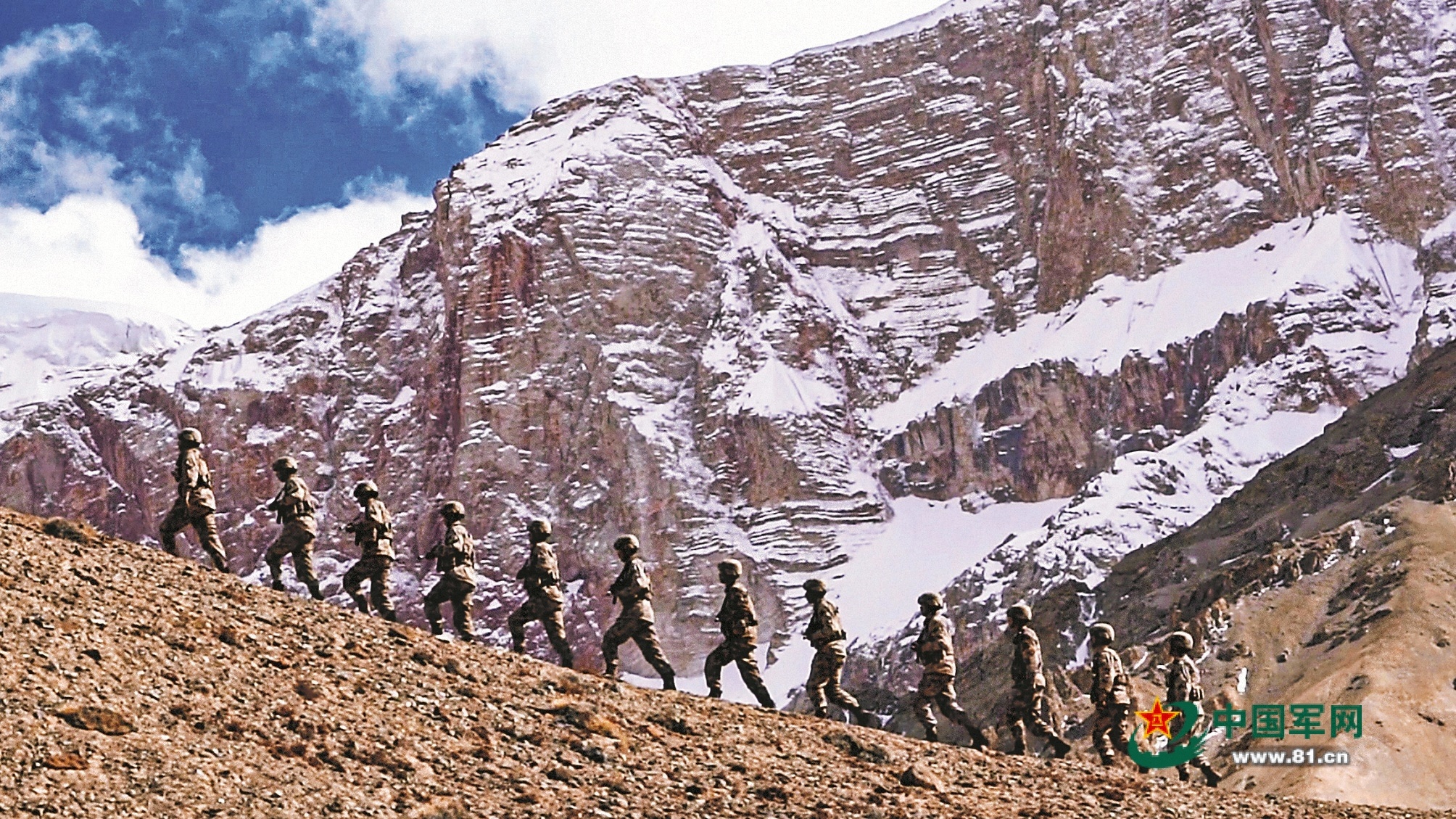 新疆和田軍分區(qū)某邊防團官兵在高原巡邏。