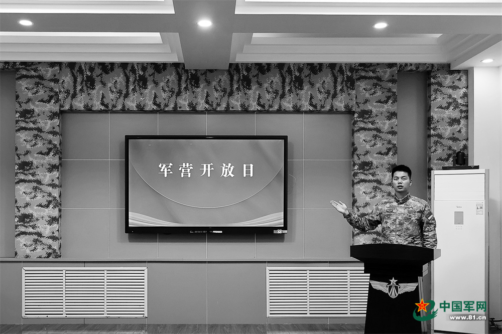 軍營(yíng)開(kāi)放日,一名排長(zhǎng)介紹部隊(duì)情況。