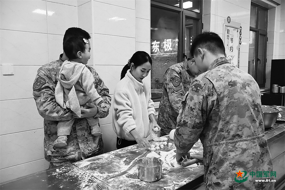 探親軍嫂與戰(zhàn)士一起包餃子。