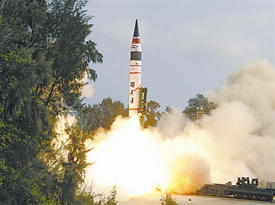 印度核武庫的發(fā)展已遠(yuǎn)遠(yuǎn)超出“最低限度核威懾”的宣傳口號,正逐步擁有陸基洲際導(dǎo)彈、戰(zhàn)略核潛艇與戰(zhàn)略轟炸機(jī)這些核大國的“標(biāo)配”。?2012年4月,印度成功試射射程達(dá)5000公里的“烈火-5”導(dǎo)彈,躋身“洲際導(dǎo)彈俱樂部”?!傲一?5”導(dǎo)彈的三級都由固體燃料推進(jìn),可攜帶多枚核彈頭。雖然存在精度不高等缺點(diǎn),但“烈火-5”的試射成功讓印度舉國歡慶,印度評價(jià)為“尋求和開拓科學(xué)前沿的又一里程碑”。該型導(dǎo)彈還可改裝,用來發(fā)射小衛(wèi)星,甚至可用來擊落在軌的敵方衛(wèi)星。此外,在研的“烈火-6”,射程更是達(dá)到8000至10000公里。